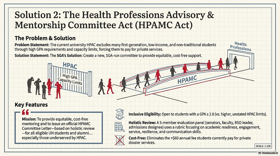 LET IT BE ENACTED THAT the Student Government Association of the University of Houston establishes the Health Professions Advisory & Mentorship Committee Act (HPAMC Act), guaranteeing equitable, cost‑free committee letters and mentorship for all eligible UH students and alumni applying to health‑profession programs, with oversight from the Appropriations Committee and collaboration with campus pre‑health organizations, Tilman J. Fertitta College of Medicine Admissions, and NSM faculaty thereby promoting academic success, opportunity, and informed decision‑making.